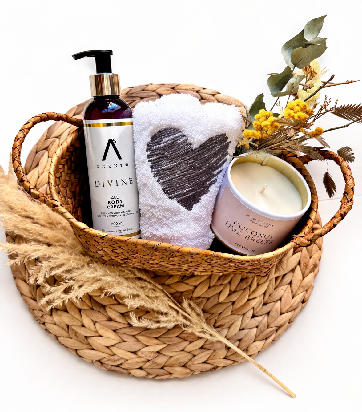 Krepšelyje – kokosų ir laimo kvapo žvakė, vonios rankšluostukas ir kūno kremas “DIVINE” (natos: vanilė, kalabrijos bergamotė, citrinos žievelė, apelsinas, sandalmedis).