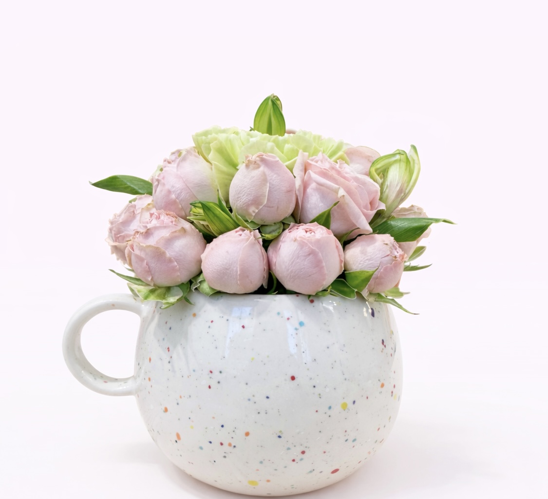 Kruopščiai atrinktos gyvos gėlės komponuojamos unikaliuose, rankų darbo keraminiuose puodeliuose, kurie kiekvienai puokštei suteikia jaukumo ir išskirtinumo. Tai ne tik gėlių kompozicija, bet ir ilgalaikė dovana – puodelis išlieka kaip mielas prisiminimas.